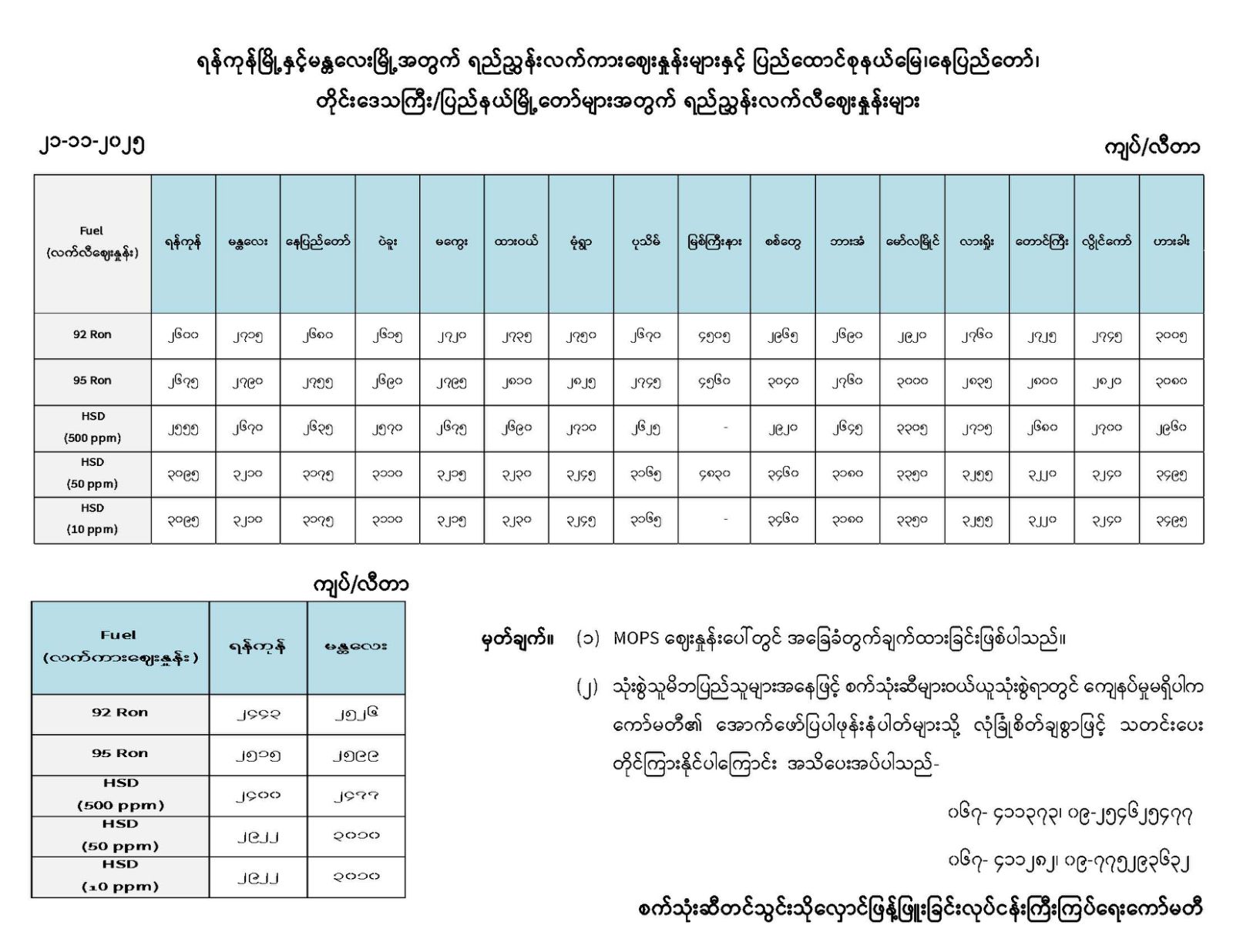 Fuel Price : ၂၄-၁၁-၂၀၂၅ ရက်နေ့ ရည်ညွှန်းစက်သုံးဆီစျေးနှုန်းများ [. . .]